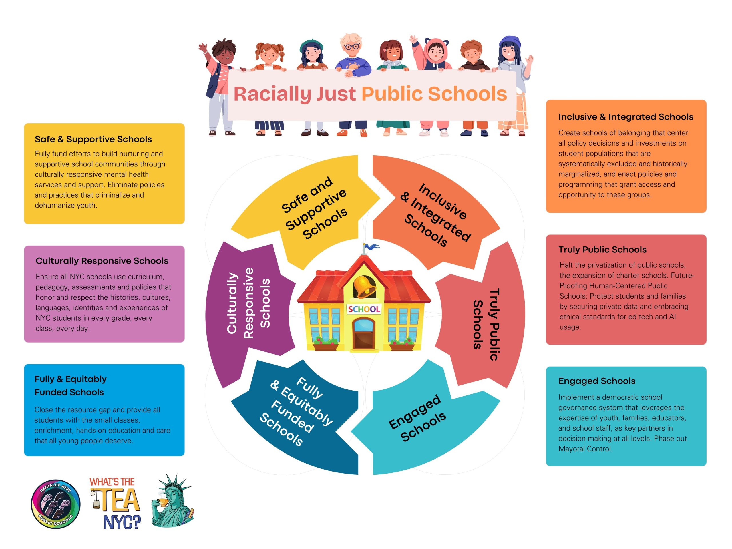 New Yorkers for Racially Just Public Schools (RJPS) and our coalition partners have been working to build schools that deserve our students for decades. We have achieved significant victories, but the work is not yet done. Our Vision for Racially Just Public Schools offers a comprehensive and holistic approach to public education that counters the poisonous education policy agenda presented by the Trump administration. We need a Mayor who will join the fight to protect public education in NYC from Pre-K to CUNY. Our vision centers systematically excluded and historically marginalized groups, especially, recent arrivals, English Language Learners, students with disabilities, students in temporary housing, students in foster care, and students involved in the juvenile/criminal justice system, and LGBTQ+, and gender nonconforming students.