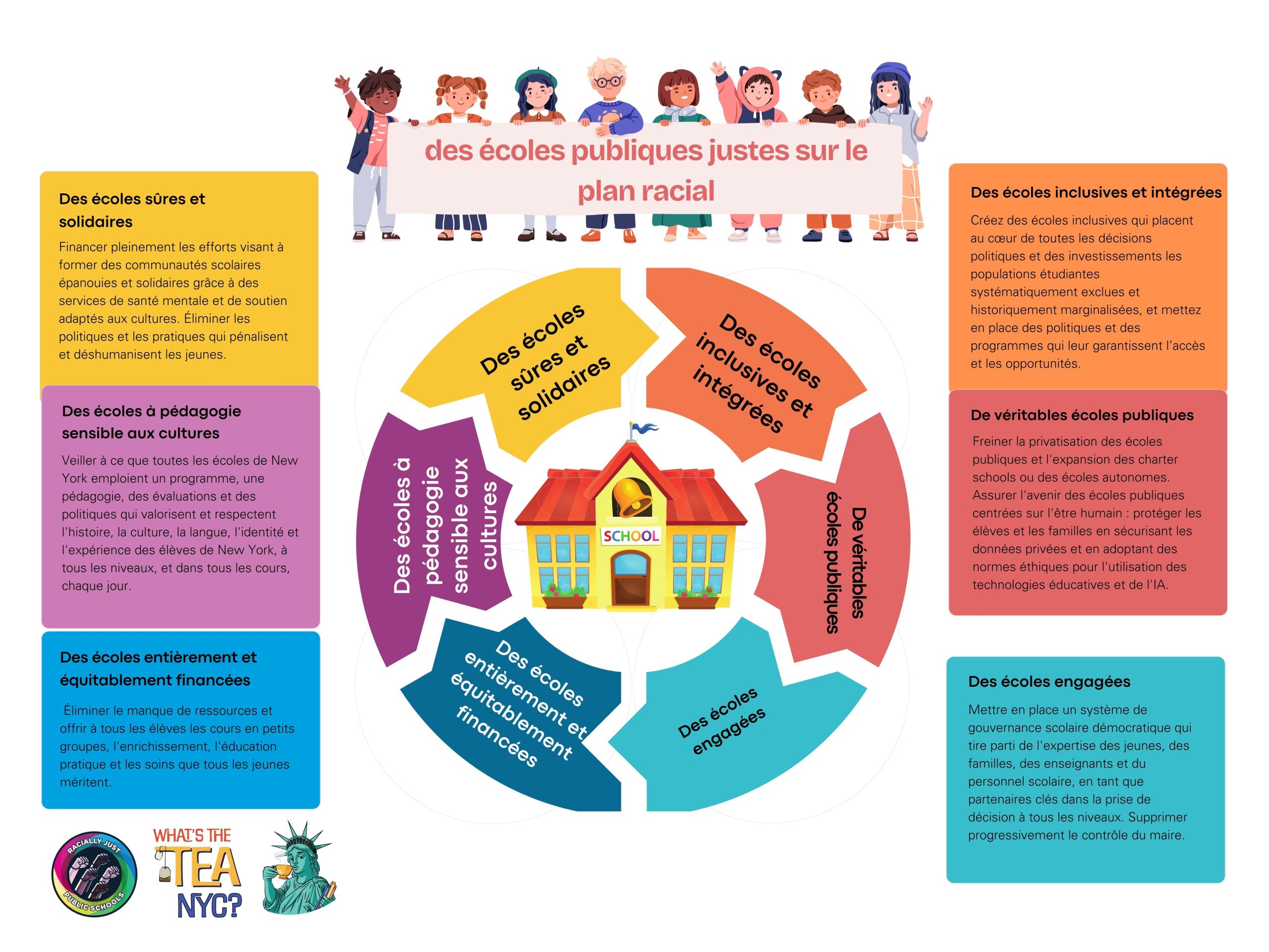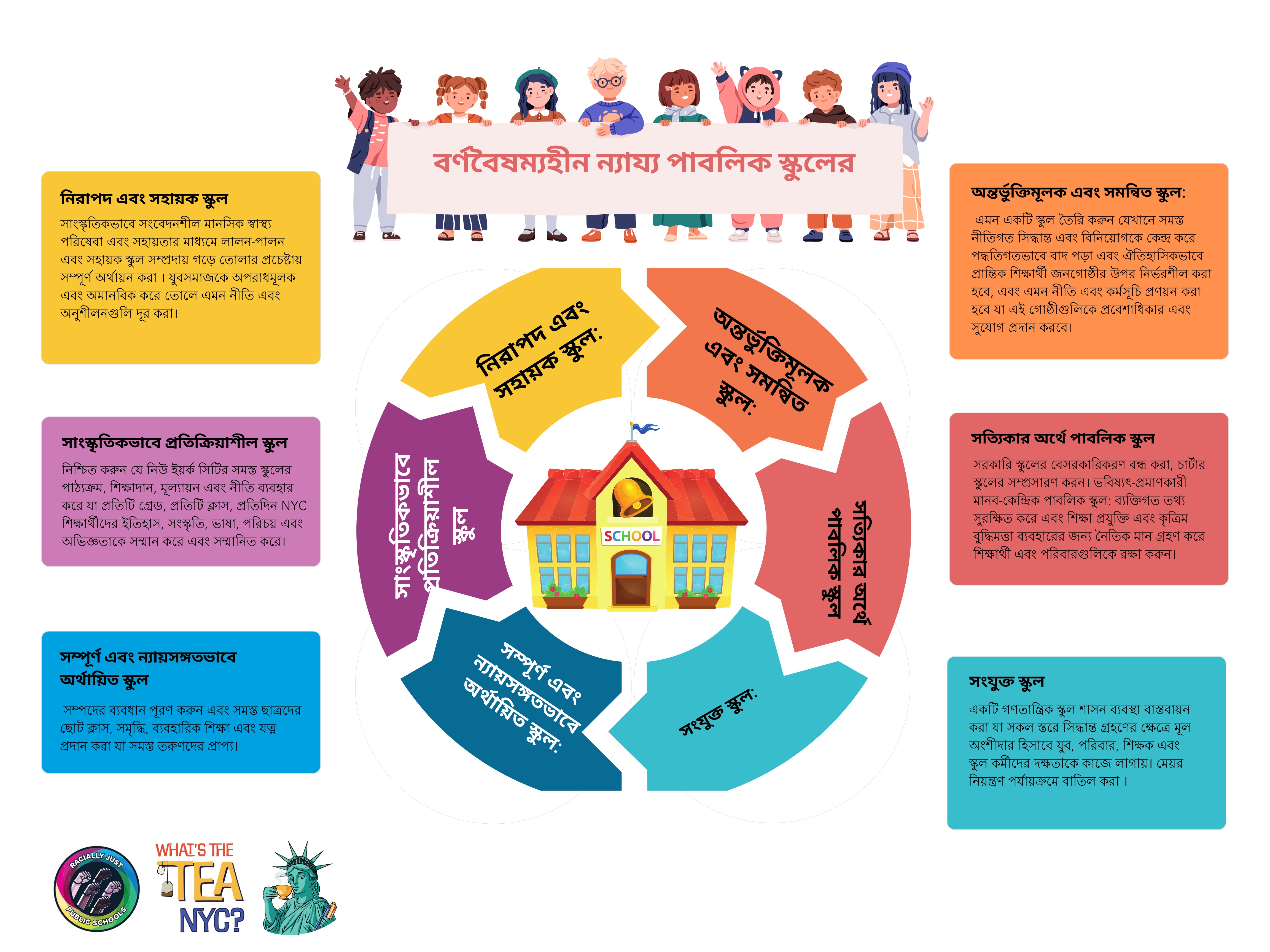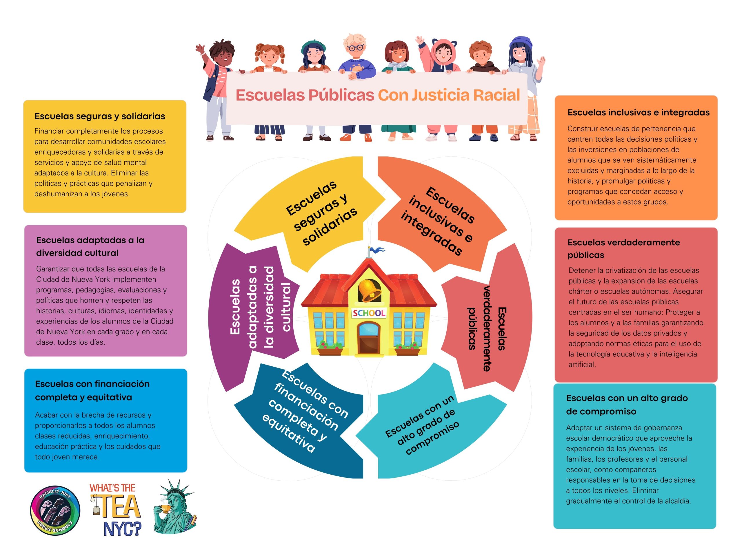 - Schools that use curriculum, pedagogy, assessments and policies that honor and respect the histories, cultures, languages, identities and experiences of NYC students in every grade, every class, every day.